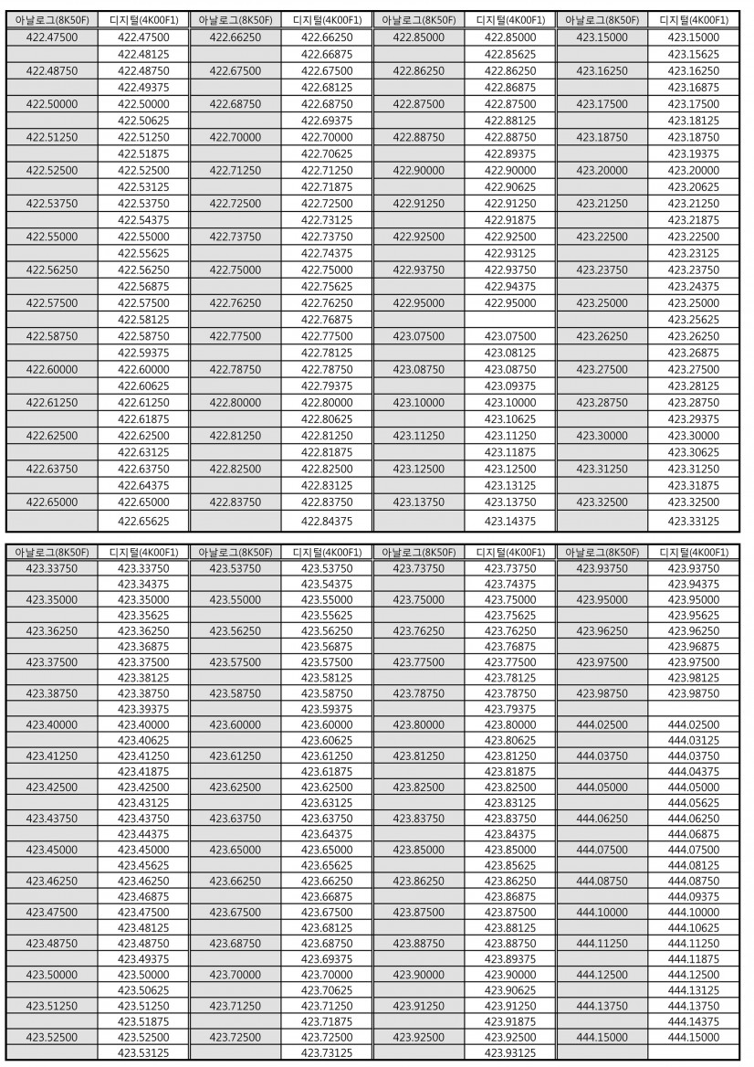 목록 [기타] 400M 간이주파수 차트 작성자 잘텍 작성일 17-05-01 14:23 | 조회 62,006 | 댓글 0 본문 아날로그 / 디지털 이전글다음글 댓글목록 0 등록된 댓글이 없습니다. 목록